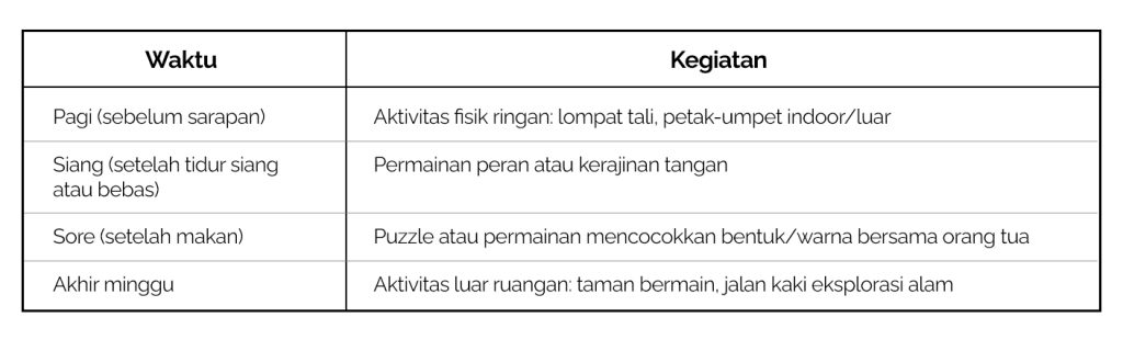 Dengan jadwal yang fleksibel ini, permainan stimulasi akan jadi rutinitas yang menyenangkan, bukan beban.